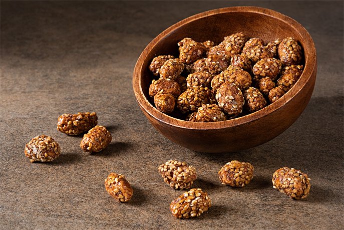 • Kavrulmuş yer fıstığı + doğal bal + susam kaplama