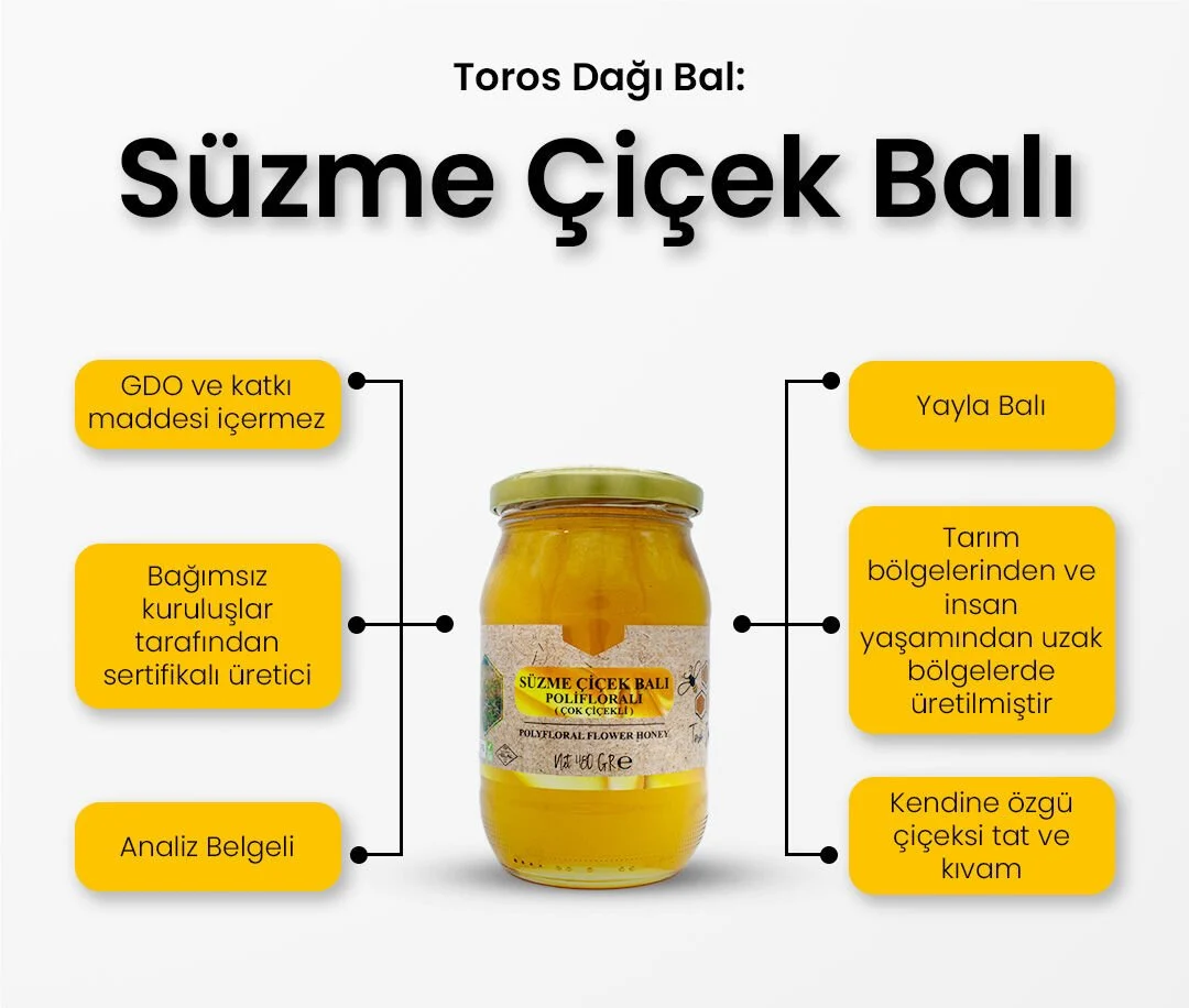 Toros Dağları’nın temiz doğasında üretilen bu çiçek balı, laboratuvar kontrollerinden geçirilerek kalite standartlarına uygun şekilde sofralarınıza ulaşır.