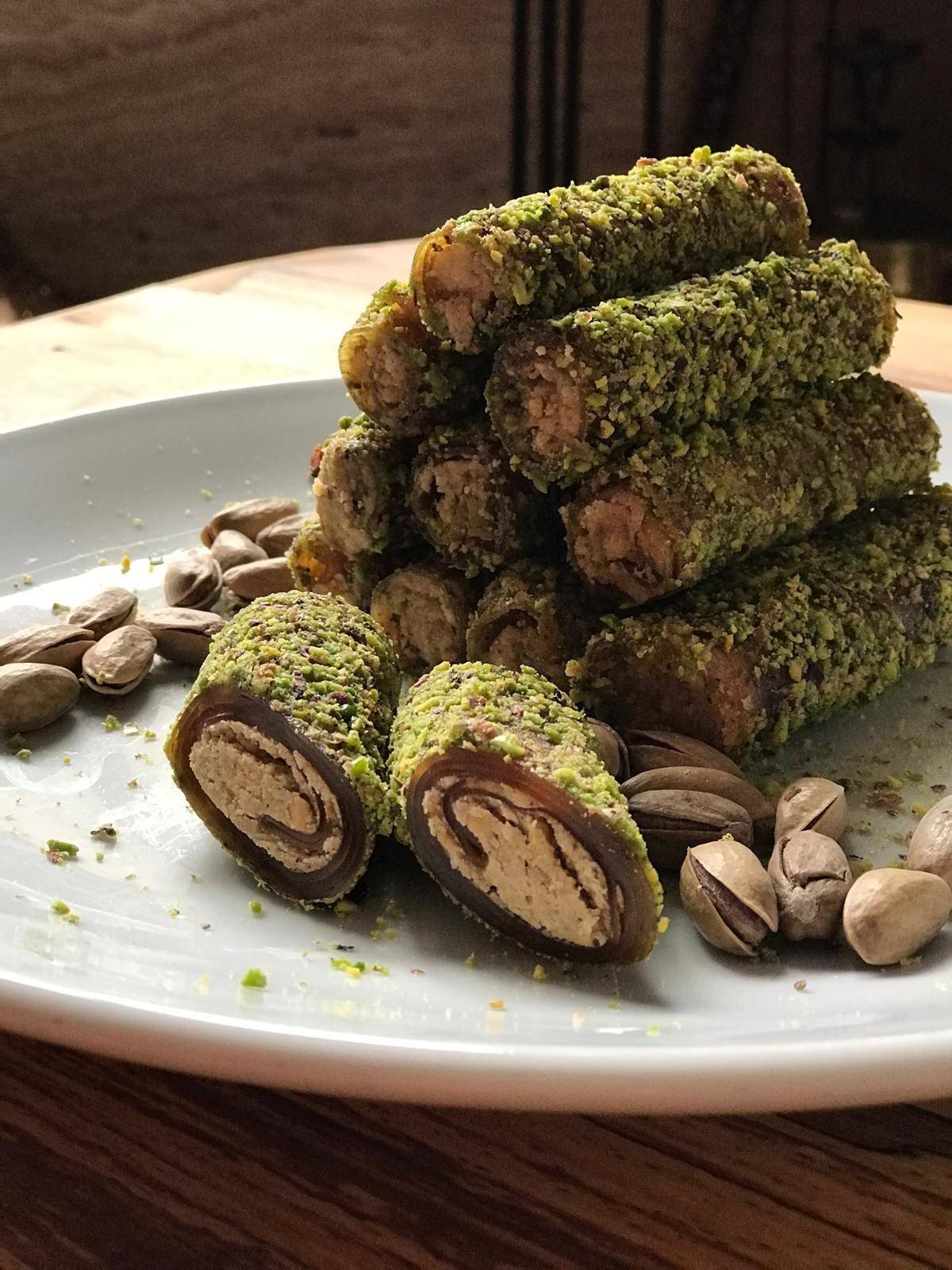 Gümüşhane pestili ve Giresun fındığı ile hazırlanan, Antep fıstığıyla kaplanmış doğal ve katkısız rulo sarma tatlısı. %100 doğal, glikozsuz ve lezzet dolu!