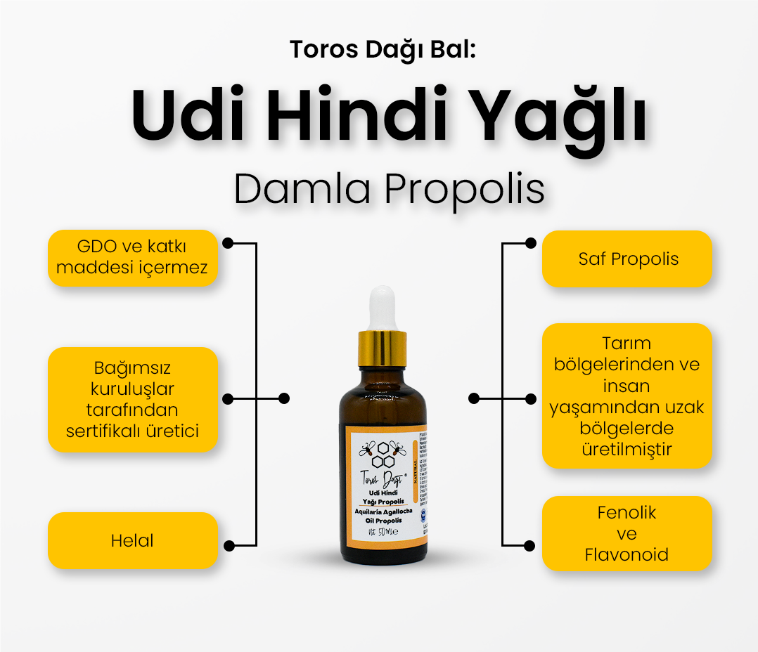 Udi hindi yağı ve propolis içeren doğal bitkisel destek ürünü. Bağışıklık sistemini desteklemeye yardımcı olabilecek arı ürünü.